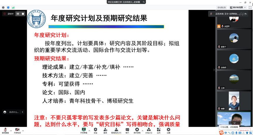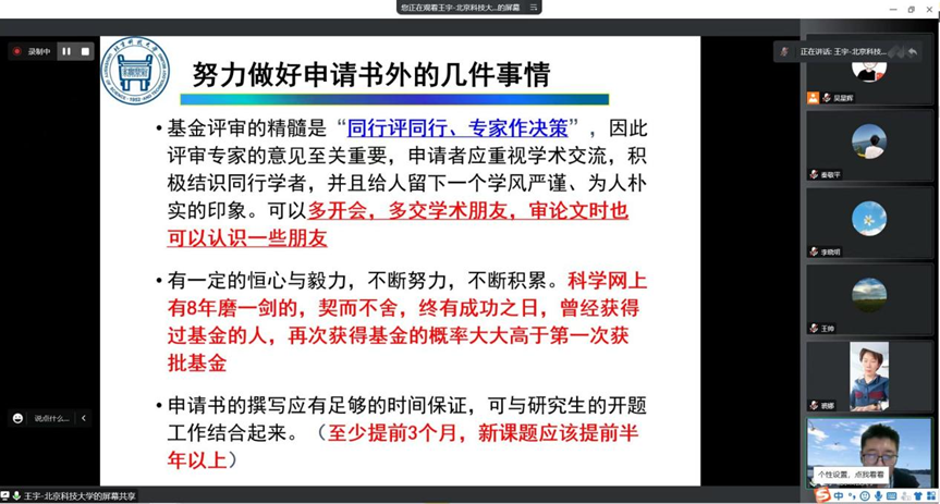 2022年11月17日下午,bat365正版唯一官网召开了国家自然科学基金线上辅导会。此次辅导会特邀北京科技大学王宇教授进行基金申报辅导。会议由副院长裘娜主持,全体教师参会并听取专家意见。