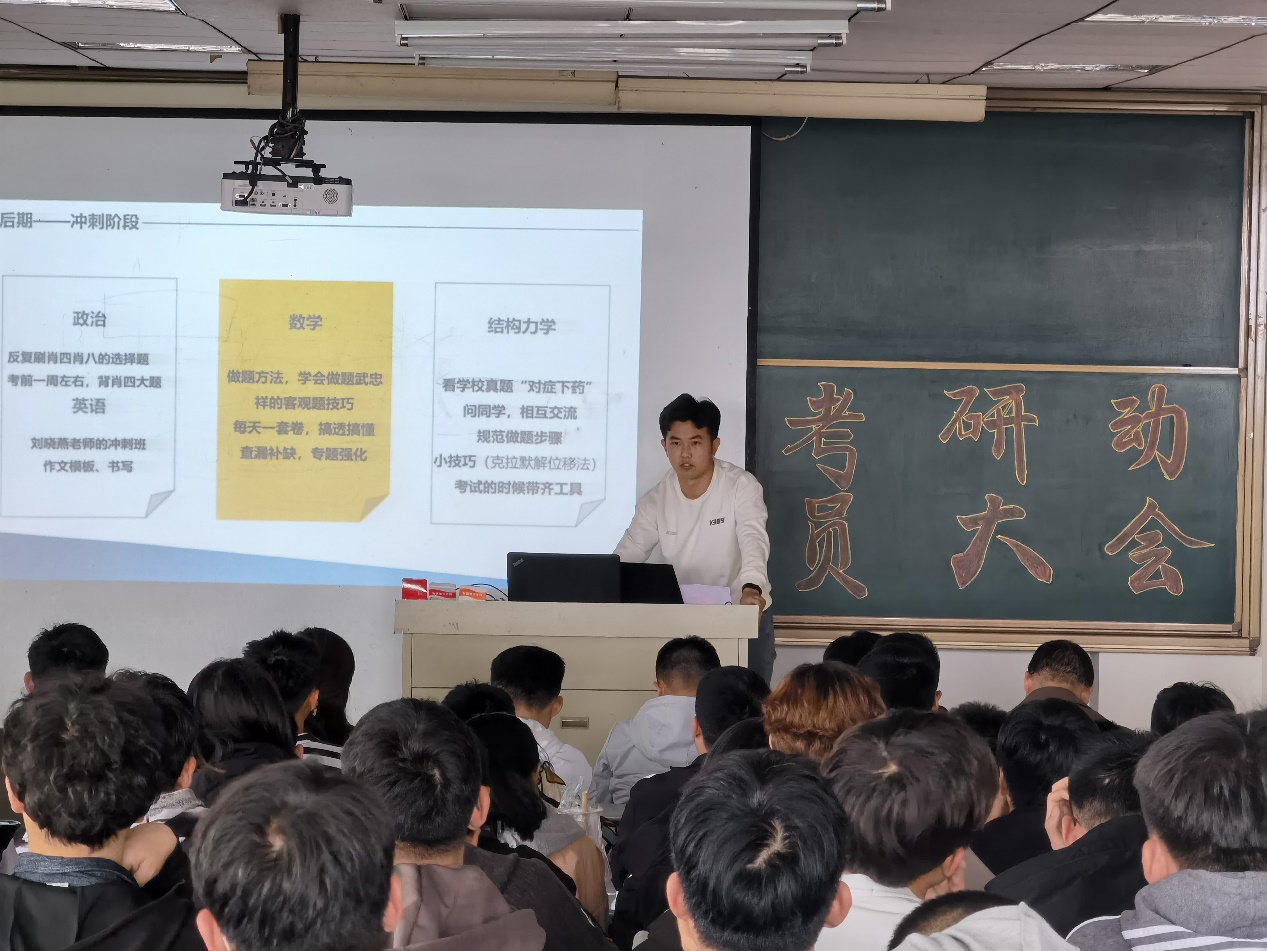 为进一步调动城建学子考研积极性,营造浓郁的考研氛围,解决考研准备阶段的迷茫和困惑,4月14日,bat365正版唯一官网2022年考研动员大会在理工楼2505教室举行。bat365正版唯一官网副院长裘娜、考研指导教师代表、2021届优秀学生代表以及2022届学生参加了大会。