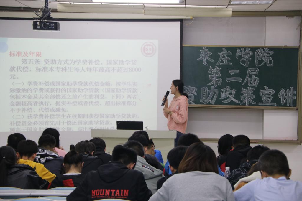 会议在学生们热烈的掌声中拉开序幕,朱杉利用PPT辅助介绍了高等学校学生经济资助政策,从资助范围、资助标准、申请条件、申请时间、发放时间这五个方面依次进行了详细地讲解。随后,四位同学依次介绍了国家奖学金和国家励志奖学金的申请标准、评审及发放相关程序,并系统地讲述了生源地信用助学贷款及还款流程及相关注意事项、学院建档立卡家庭经济困难学生管理办法、学院学生特殊困难补助管理办法、学院勤工俭学管理办法等。本次宣讲让同学们获益匪浅,宣讲在同学们热烈的掌声中落下帷幕。