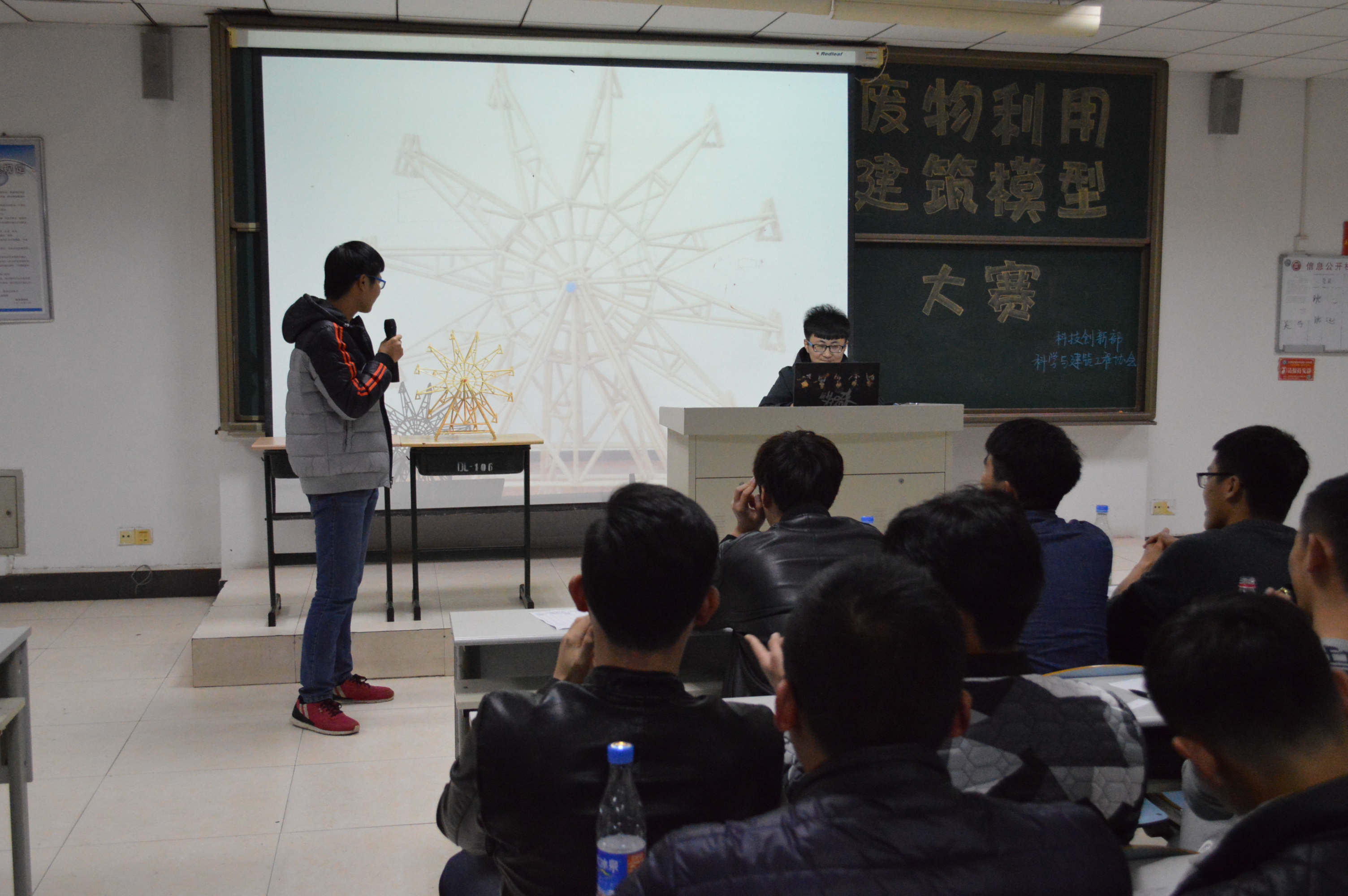 比赛伊始,主持人介绍了本次比赛的理念和特色,即“废物利用,环保创新”,充分利用生活废弃物,集创新于一体,构建具有实用性或观赏性的建筑模型。比赛中,各个参赛团队都自信满满、充满激情的在讲台上介绍各自独具匠心的建筑模型,每一件作品都是团队智慧与汗水的结晶,更是理论知识与创新能力的见证。其中,来自于15土木工程2班的张春峰带来的《摩天轮》吸引了所有在场的评委和观众的目光,它光滑而干净的外观展现出了它独特的风采。作品《天使之翼》以它鲜艳的颜色和独具的创意将比赛推向高潮,活跃了现场的气氛。经过现场各个参赛团队的展示和讲解,作品《摩天轮》获得一等奖,《辽宁舰》和《天使之翼》斩获二等奖,更有多个团队获得三等奖和优秀奖。