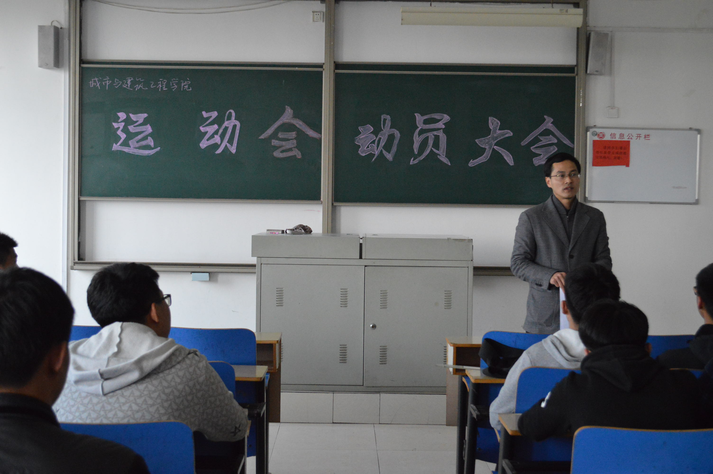 ,城建学院运动会动员大会在理工楼2518教室举行,辅导员、全体运动员及学生会成员参加,院长李振清出席本次会议。