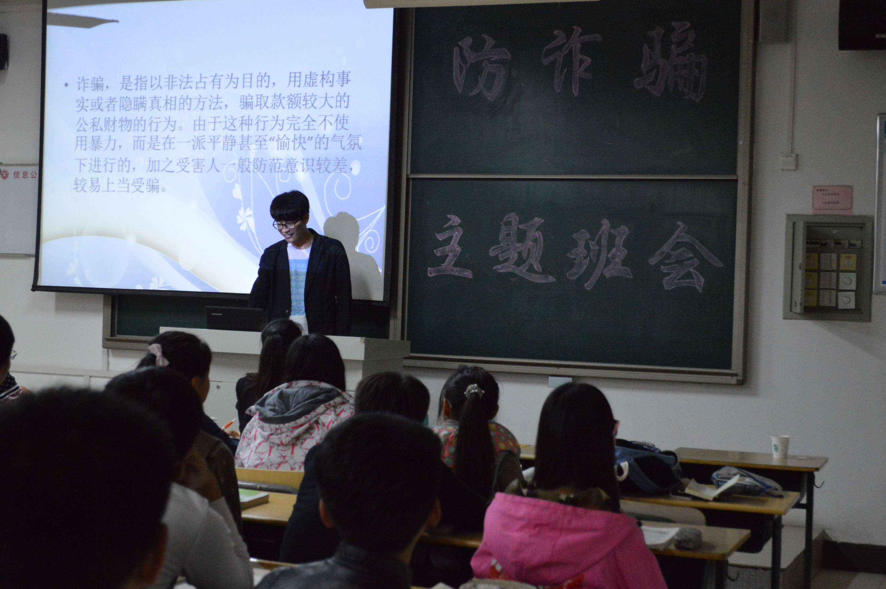 关注自身,财产安全,构建和谐校园。10月23日晚,14级土木工程一、二班分别在理工楼2516、2517举办以“预防诈骗”为主题的班会,班会由助理导员张宇颖,潘国栋主持,14级土木工程全体学生参加,辅导员李扬做了最后总结.