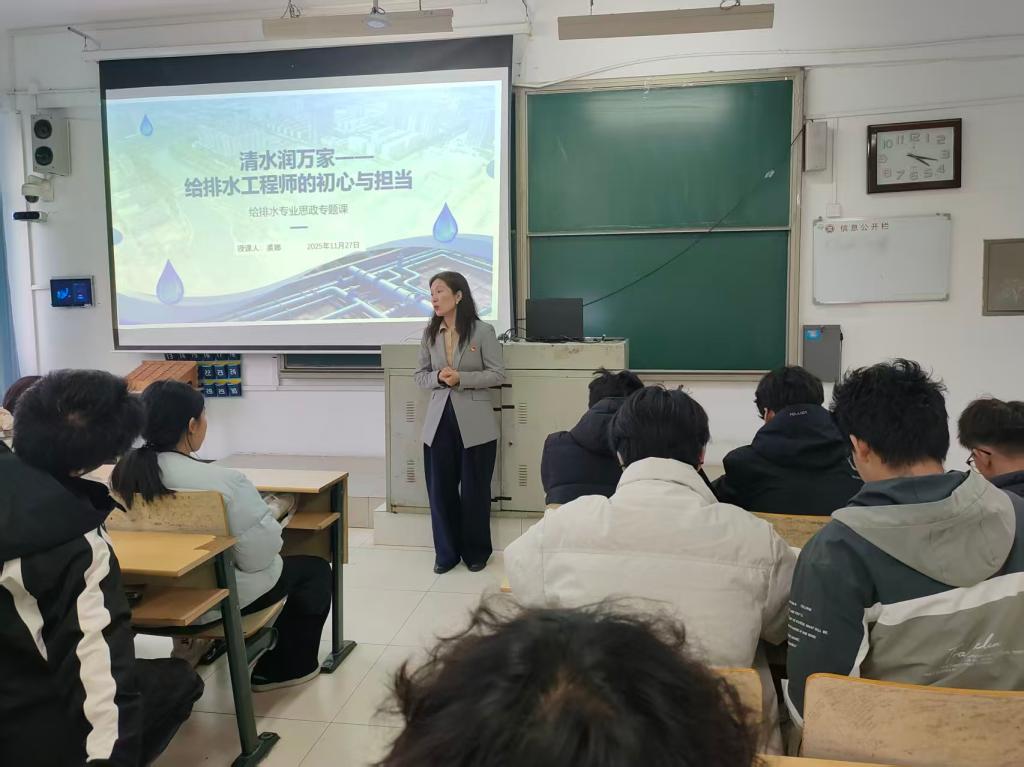 为引导青年学生将专业所长与时代使命紧密结合,11月27日,bat365正版唯一官网院长裘娜以“清水润万家——给排水工程师的初心与担当”为主题,为25级给排水科学与工程专业学生带来一堂内涵丰富、贴近实际的专题思政课,让学生在感悟专业价值中明确成长方向。