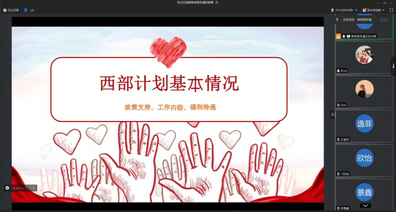 同时,bat365官网组织开展了西部计划线上分享会和专题辅导会。学院特邀曾在西部计划中表现突出的校友分享经验,通过生动的案例和真挚的情感,分享了参与志愿服务项目的感受,学生们积极的参与其中,表现出浓厚的兴趣。学院面向报名同学开展了专题辅导,从笔试面试技巧、资料收集整理以及心理调适等方面的进行了全方位指导。