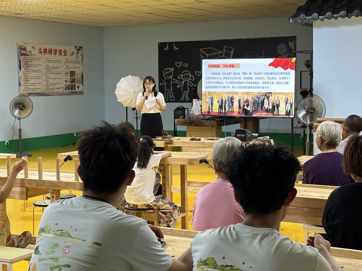团队思政导师、马克思主义学院王婷婷老师在非遗小院开讲“两弹一星”微党课;“两弹一星”精神宣讲团队成员通过《生活中的核辐射》科普课堂,用科学破除认知迷雾,为村民普及核辐射知识,激发孩子们弘扬“两弹一星”精神的热情;实践团还开展了“班墨匠心,智启未来”主题宣讲,开展“鲁班小工匠”挑战赛、未来工匠畅想墙等活动,小朋友们、村民与青年志愿者共话技艺传承与乡村发展。