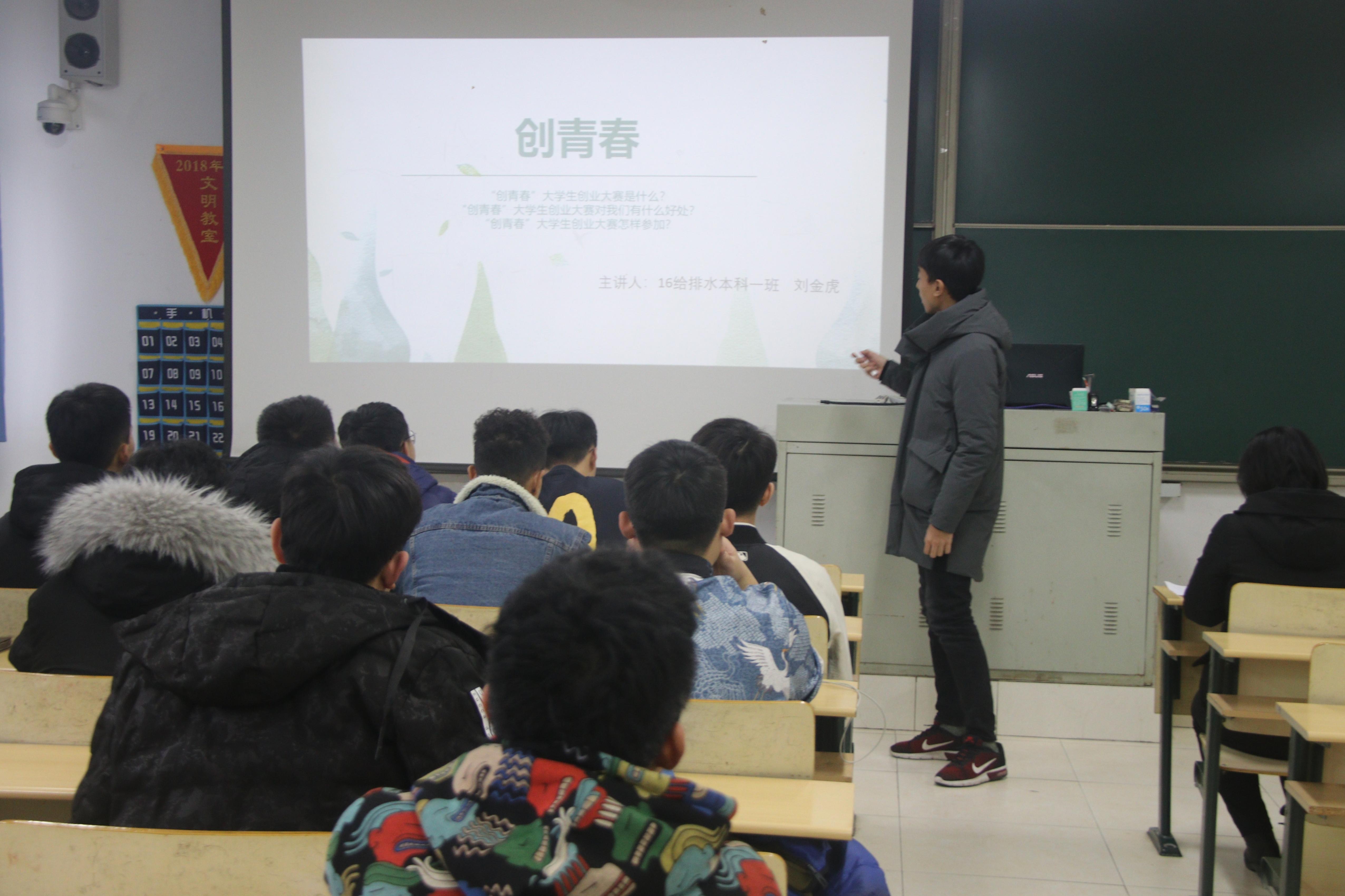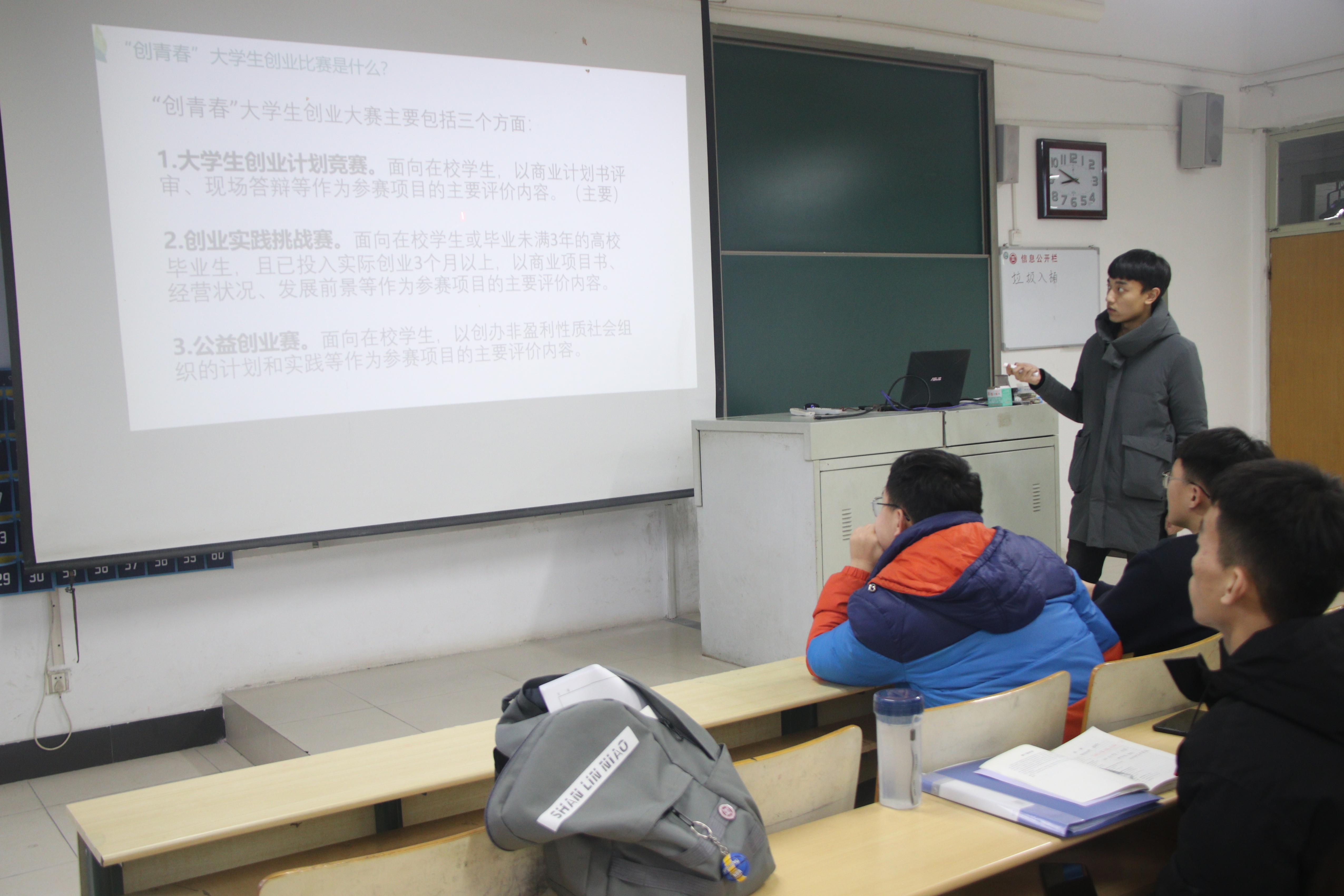 会上刘金虎同学讲述了他自己的创业大赛的历程,分享了个人的经验与启示。之后杜书记也指出希望各班班委踊跃报名参加学校的创业大赛活动,并起到模范带头作用,带动班级的更多同学进入这项活动当中。