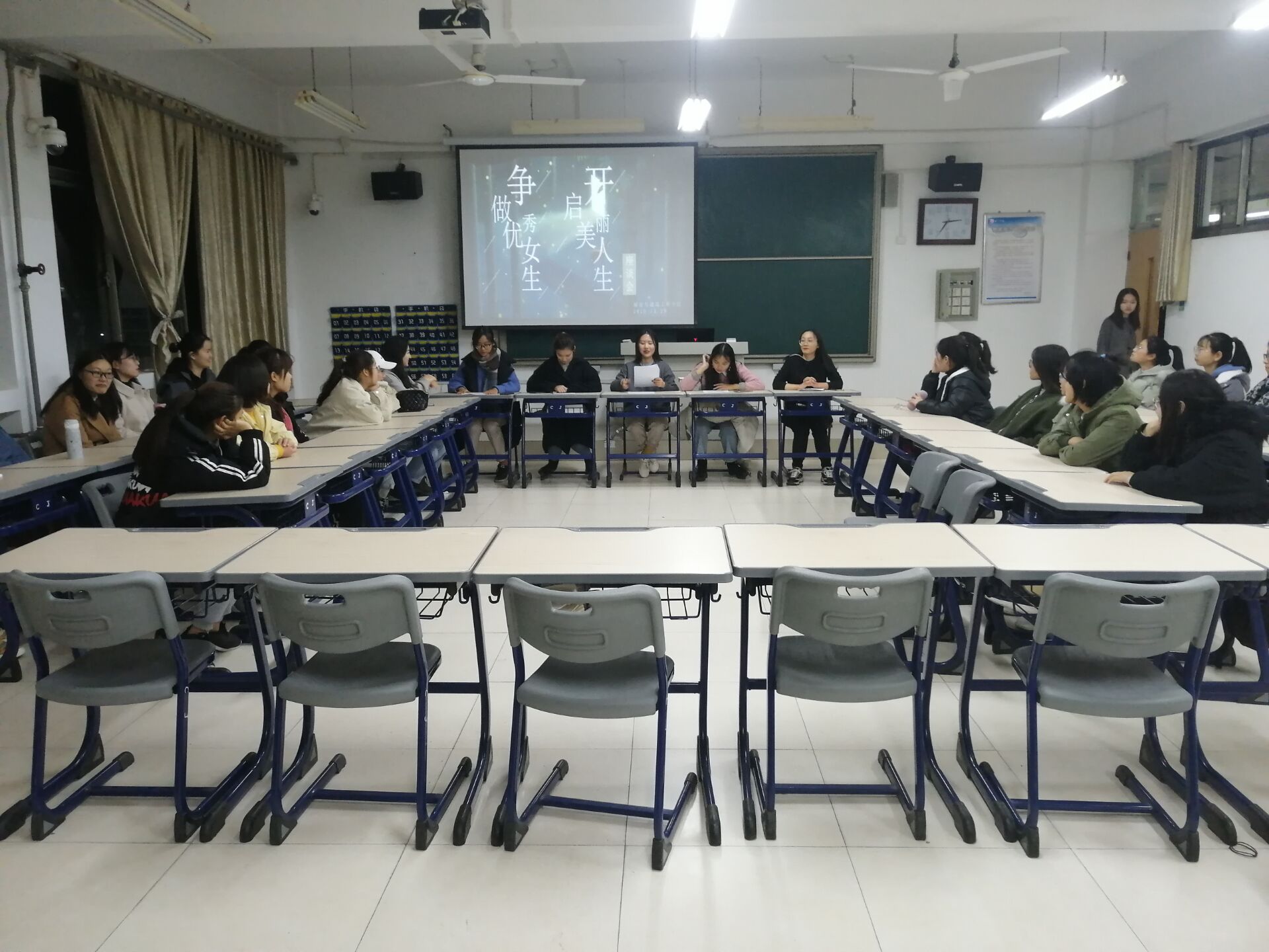 本次座谈会的主要内容包括:普及心理健康及日常安全知识、树立正确的恋爱关系、提高文学素养、学习化妆技巧四个方面。在轻松、开放的氛围中,女生们讨论了自己关于树立正确恋爱关系的观点,作为女生一定要自尊自爱。三位同学分别分享了阅读《雷雨》、《简爱》、《人生若只如初见》的收获和体会,推荐大家多阅读文学作品,提高个人的文学素养,由内而外的丰富和提高自己。通过讲解和现场化妆的方式,大家也了解了一些基本的化妆技巧。