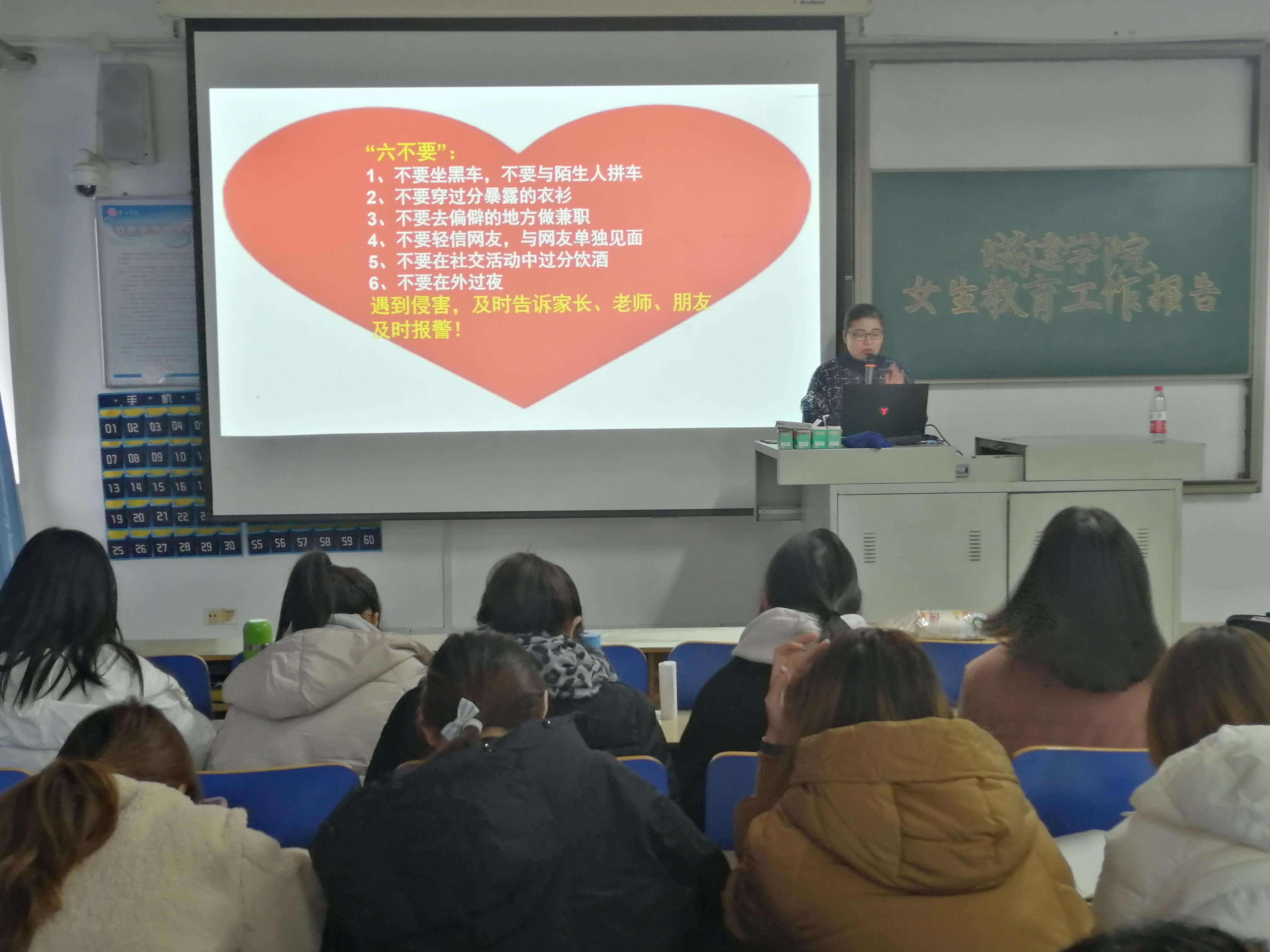为提高bat365官网女生的安全防范意识,增强女生的自我保护能力,11月27日下午,bat365正版唯一官网在理工楼2518教室举办了“你若安好,便是晴天”女大学生安全教育报告。学校女生教育工作组成员葛晓霞老师主讲,bat365官网18级、19级女生参加了该讲座。