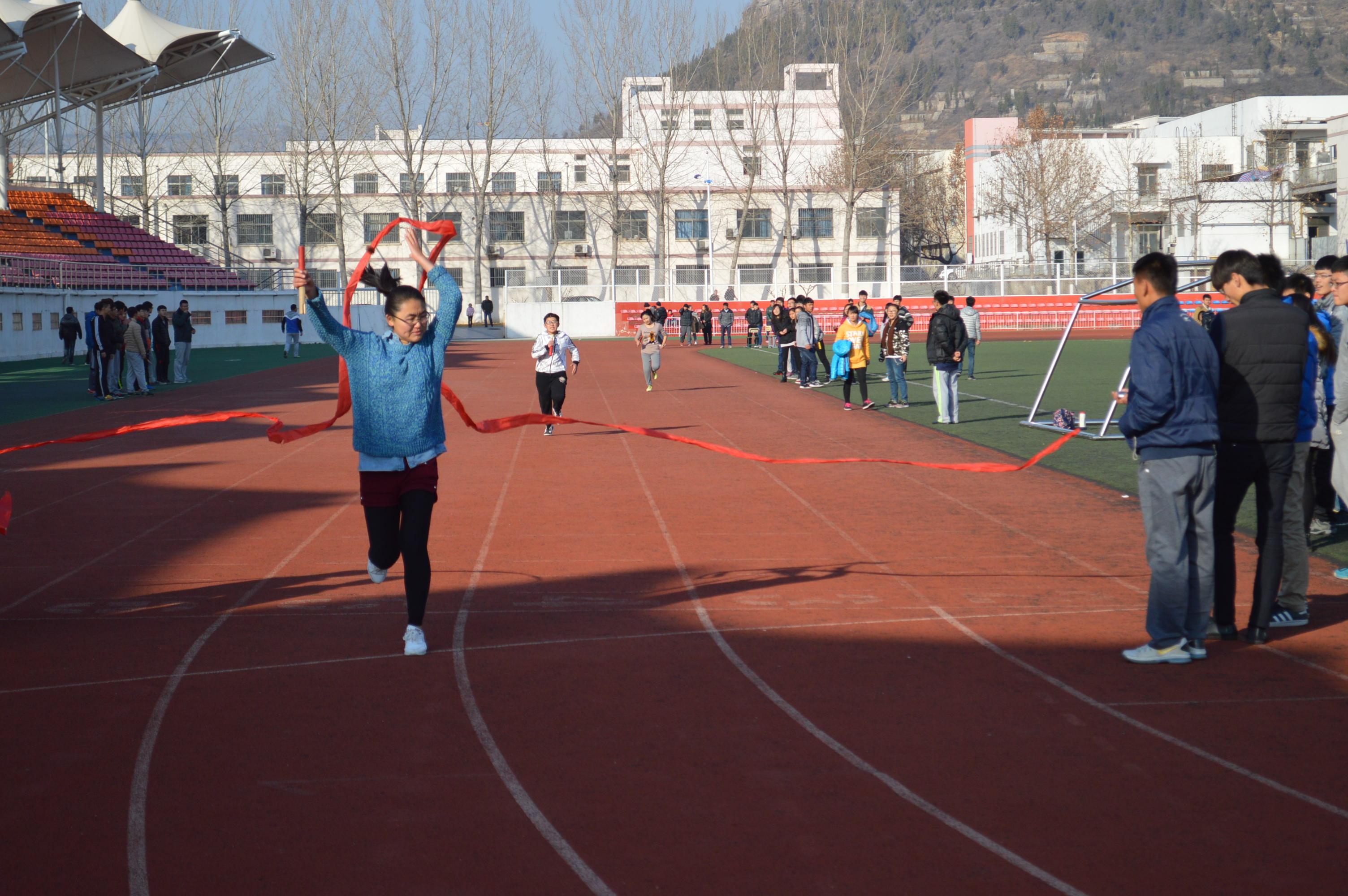 此次运动会吸引了众多新生的积极参与,场面异常热烈。运动会共分为田径类和趣味类两个模块,比赛项目丰富多彩,其中田径类包括100米、400米、4*100米接力赛、背抛实心球、跳远等项目;趣味类包括十人十一足、穿越火线、背夹球等。在比赛中,选手们奋勇向前、努力拼搏的精神不断感染着看台上的每一位同学。100米、400米、跳远等比赛项目让同学们懂得了在生活中如何去拼搏,在困难中如何去坚持,寒烈的冬风,挡不住他们破竹的锐气;充满童趣的“穿越火线”将同学带回到美好的童年,勾起了童年的美好回忆;4*100米接力赛、十人十一足、背夹球项目建立起同学之间的默契,让同学认识到了配合的重要性,诠释着团队的精神。运动会后,同学们大汗淋漓,脸上却绽放出美丽的笑容。