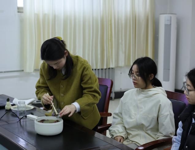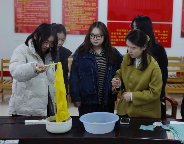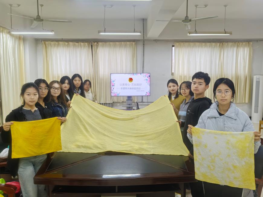 活动伊始,张萍萍老师讲解了草木染的历史渊源、染色原理及色彩系统,让同学们对这项非遗技艺有了初步的认识和了解。随后,在栀子果与石榴皮的天然染料中,同学们亲手体验了染色过程,感受着大自然赋予的色彩之美。