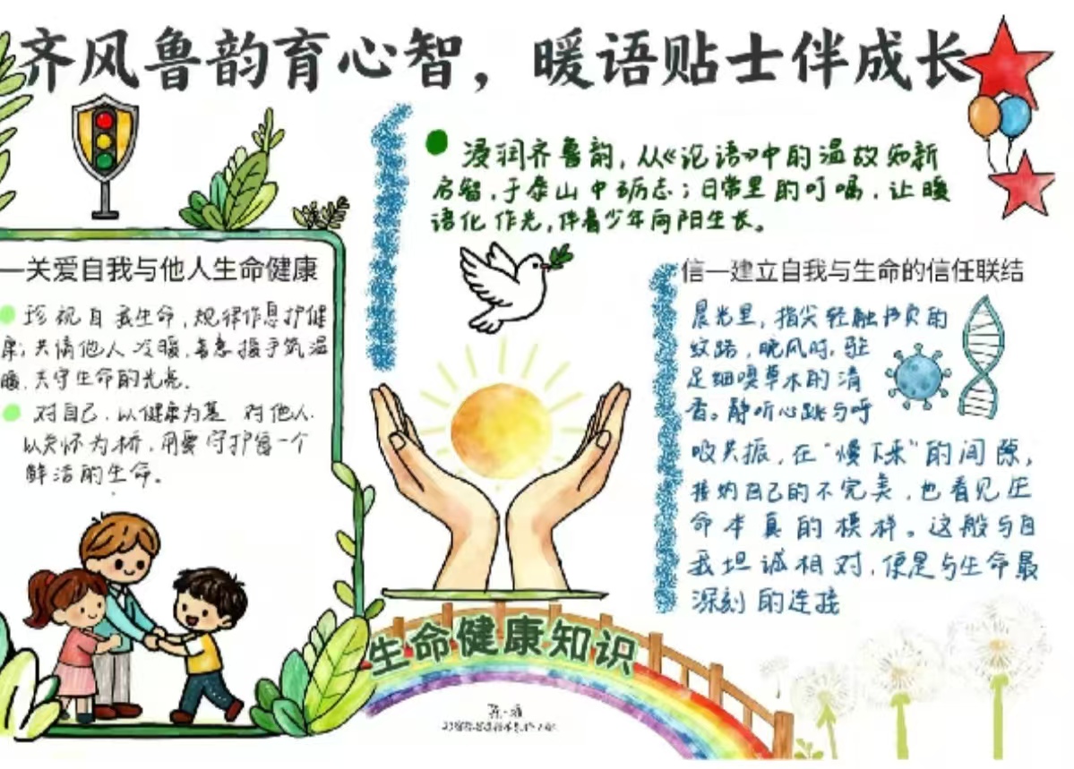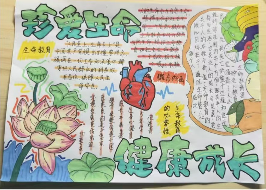 本次大赛作为学院“生命健康教育月”重要活动,以“生命健康”为核心,创新融入齐鲁文化,要求以手抄报形式呈现,既涵盖生命教育知识,又体现优秀传统文化。活动吸引全院学生积极参与,学生在创作中深研知识、挖掘文化内涵,涌现出一批高质量作品。其中《珍爱生命 健康成长》等作品,通过解读生命教育要点、融入莲花等文化符号,以生动画风与严谨内容实现知识与文化融合,展现了学生的文化素养与创新能力。