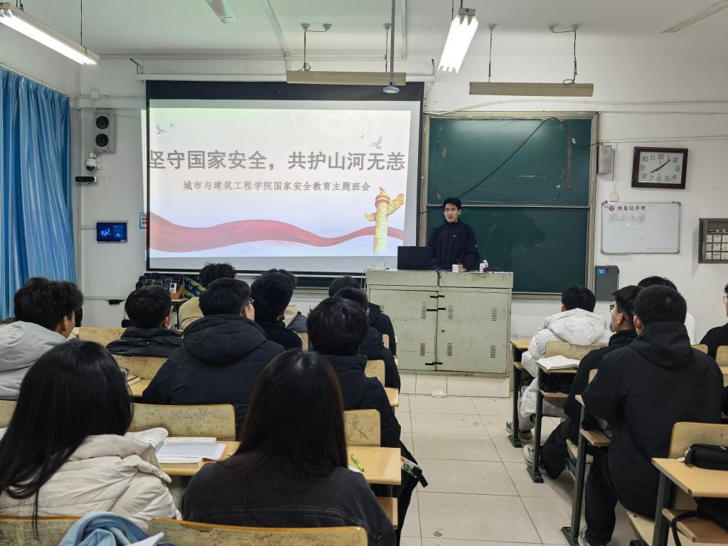 活动中,辅导员唐家良老师通过案例讲解、视频展播、互动研讨等形式,系统解读总体国家安全观的核心内涵,重点围绕政治安全、网络安全、工程信息保密等与专业紧密相关的领域展开讲解。结合建筑施工中的信息泄露案例、城市管网安全隐患事件等,生动阐释了国家安全与行业发展、个人成长的密切联系,引导学生树立“国家安全无小事,人人都是守护者”的理念。互动环节,同学们结合专业学习和实习经历,围绕“工程领域如何防范安全风险”“青年学子怎样践行国家安全责任”等话题交流发言。