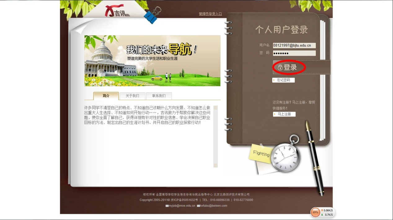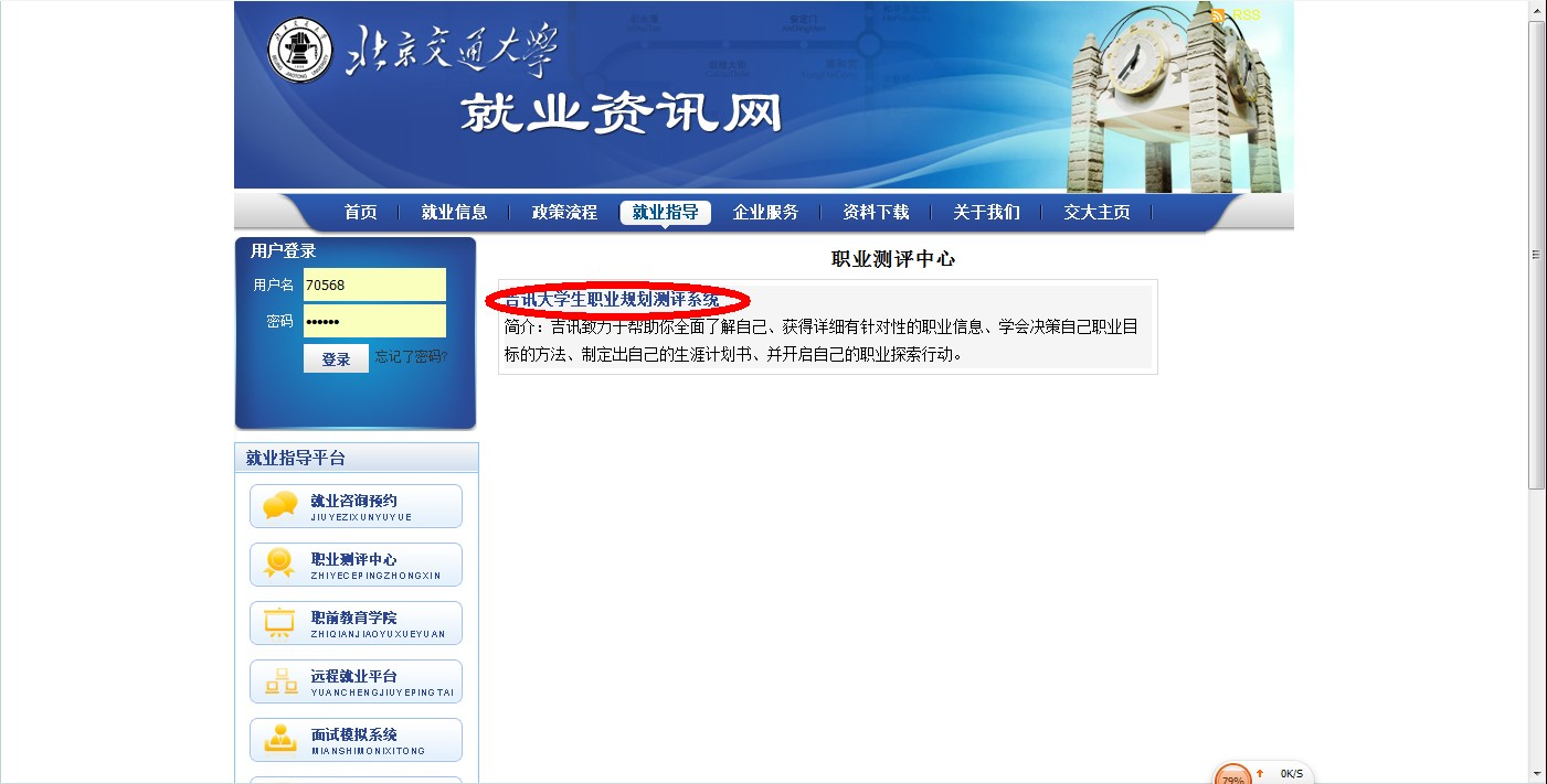 1、输入job.bjtu.edu.cn,在页面右上部“个人快捷通道”中点击“职业测评”。
