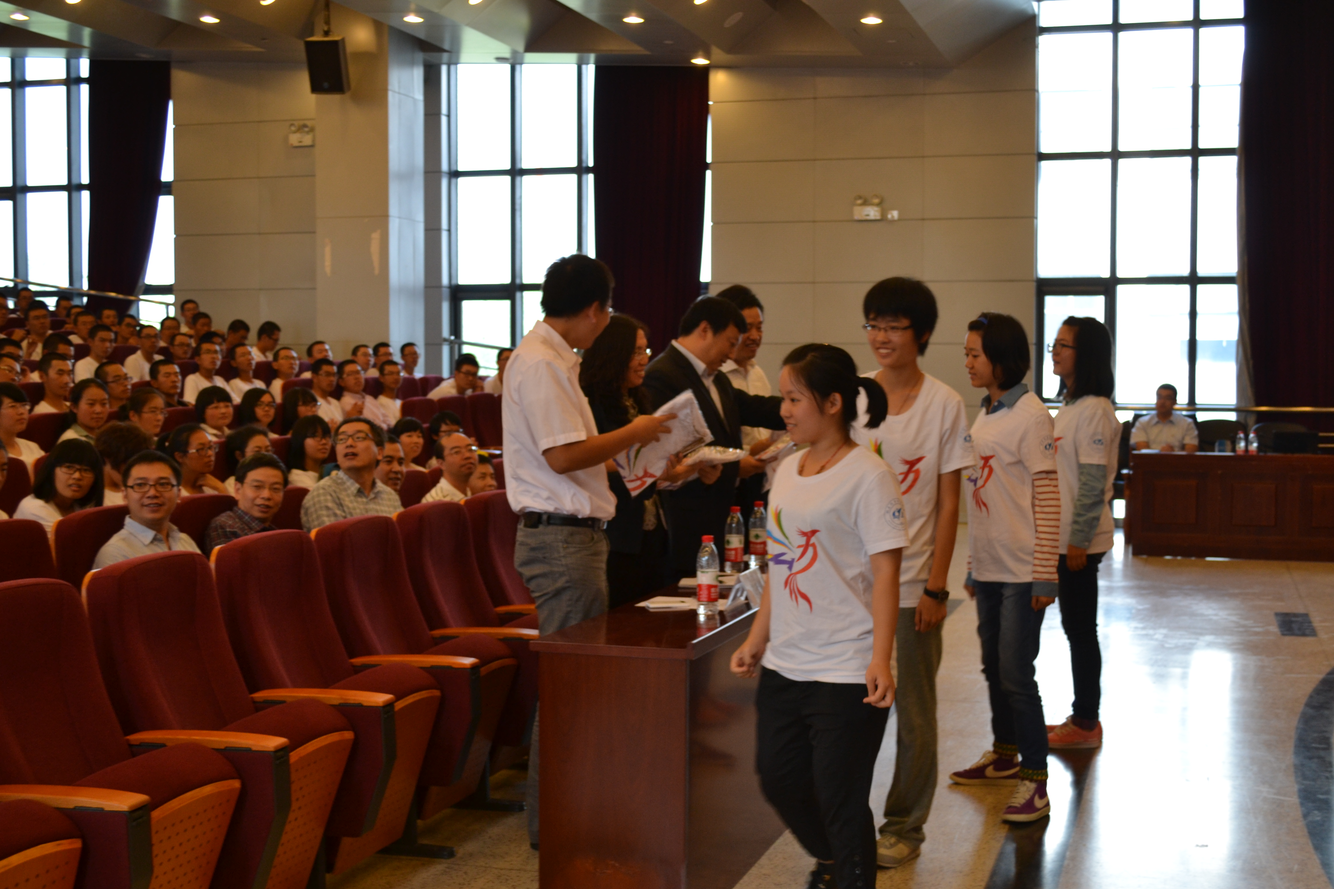 典礼最后,2014级新生代表向所有到场领导和班主任赠送了大班班服,开学典礼在同学们热烈的掌声中顺利结束。
