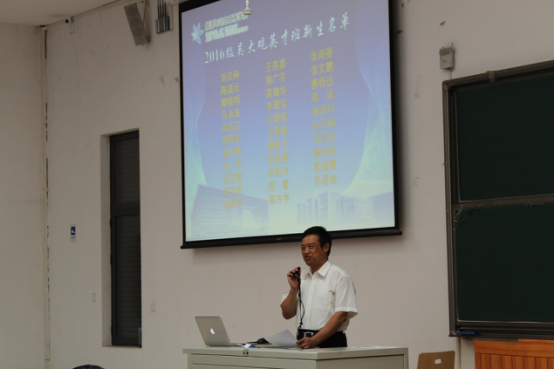 王强书记宣读了2016级“吴大观英才班”名单,对新一届吴大观英才班的同学表示祝贺,同时他也希望同学们能在这个班集体中努力提升自我,发展成才。