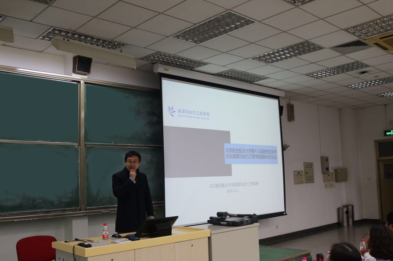 陈龙飞副院长阐述了北航能动学院的现状对校企结合的进行具有独特的优势。他说到,学术论坛的举办对航空发动机人才的发掘有着有力的推动作用,可以让更多的学生参与进来,既是对自己能力的锻炼,又可以增加视野,培养自身素质。他希望未来通过学院和企业的共同努力,把祖国能源和动力事业的发展推向新的高度。最后,他代表学院宣布,第十三届研究生学术论坛能源与动力国际分论坛正式开幕式。