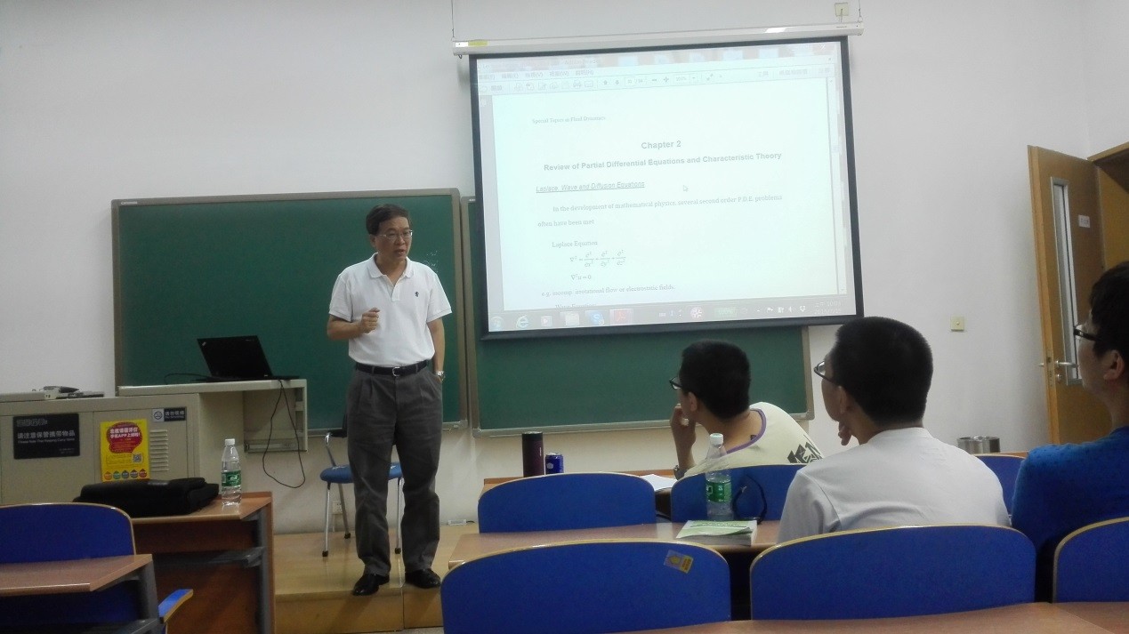 陆鹏举教授开授的“流体力学特论”引智课程,面向有一定流体力学基础知识的高年级本科生与低年级硕士生。陆教授采用了在普林斯顿、成功大学使用的英文教材、教学理念以及上课方式。从流体力学最基础的基本方程推导开始逐步引导学生进入一个全新的学术领域。课堂上,陆老师对课程内容把关十分严格和细致,从偏微分方程求解与特征线理论,到无粘流动理论与激波的基本关系式方程、方程的守恒形式等等要素全都逐一向同学们详细讲解。在课堂上,陆教授会随着课程的进行穿插许多在目前工程实际中已经得到成熟运用的计算流体力学实例来激发同学们对于学科的兴趣,并随机挑选一些经典的流体力学问题在课堂上与同学们共同讨论并寻求解决方案;而在每天的课程结束之前,陆教授又会带领大家回顾一天所学到的知识,做到温故而知新。