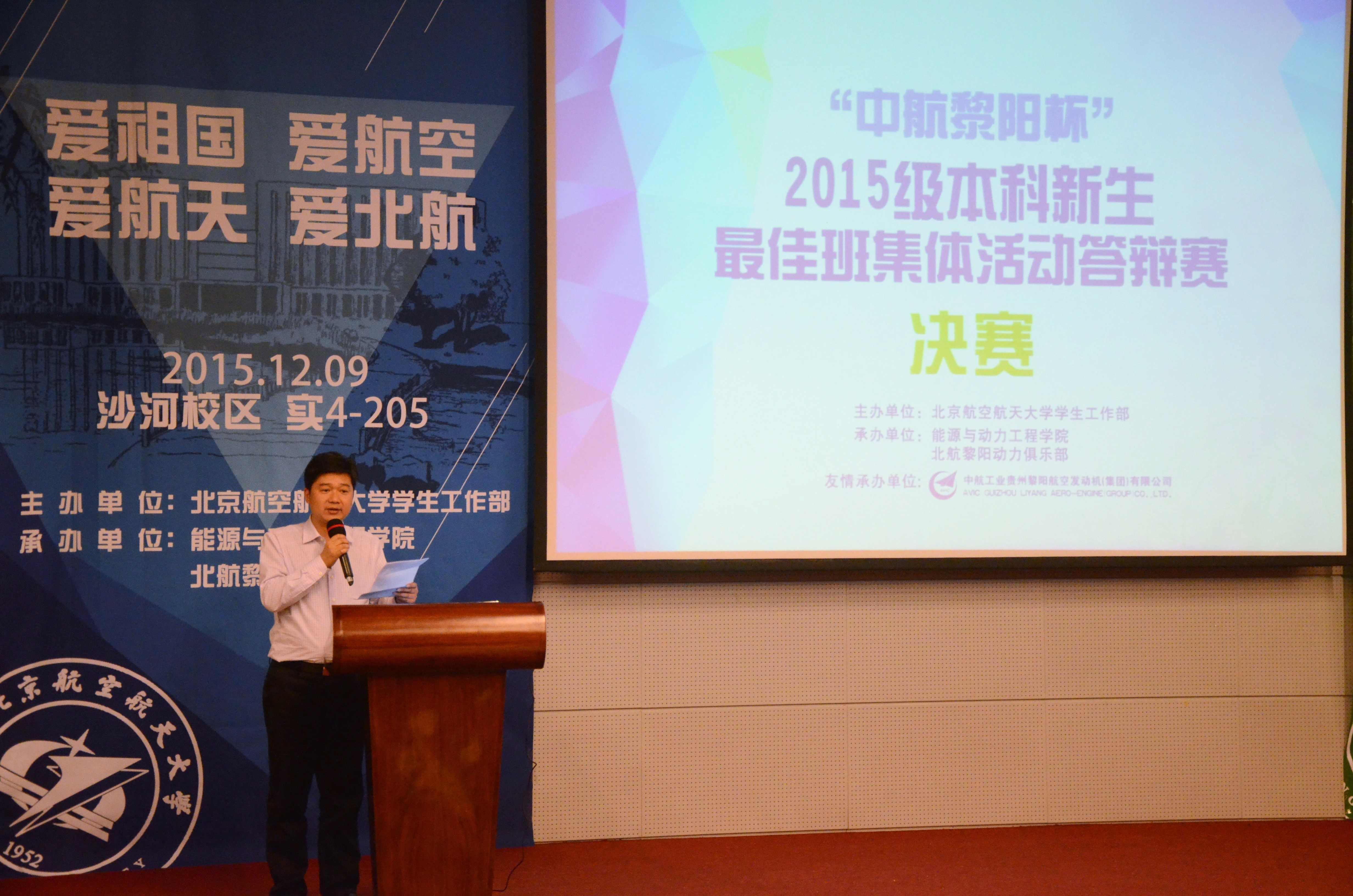 12月9日晚,由jinnian金年会学生工作部主办,jinnianhui金年会诚信至上、北航黎阳动力俱乐部共同承办的“中航黎阳杯”jinnian金年会2015级本科新生最佳班集体活动答辩赛决赛在沙河校区实验四号楼205报告厅圆满落幕。中航工业贵州黎阳航空发动机(集团)有限公司副总经理宋红团、人力资源部部长姜庆、团委书记李业龙作为嘉宾评委出席决赛,校沙河校区管委会、学生工作部、宣传部、招生就业处、教务处、保卫处、团委、后勤集团、体育部及思政学院领导老师,及各学院学生工作干部30余人出席并担任评委。沙河校区管委会主任姚仰平老师对比赛进行了点评。