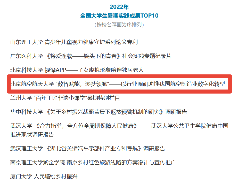 在由中国青年报社组织的2022年第八届全国大学生暑期实践展示活动中,jinnian金年会成功入围“2022年全国暑期实践大学TOP10”,动力学院心起点实践队暑期实践成果“‘数智赋能,逐梦领航’——以行业调研助推我国航空制造业数字化转型”也荣获“全国大学生暑期实践成果TOP10”,成为金年会上榜排名最高的实践成果!