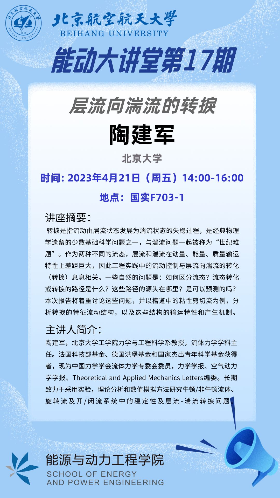 为了帮助同学们拓宽学术视野、了解学术前沿,jinnianhui金年会诚信至上特别举办高端学术论坛,邀请北京大学陶建军教授开展以“层流向湍流的转捩”为主题的学术讲座,与同学们共同探讨转捩难题。
