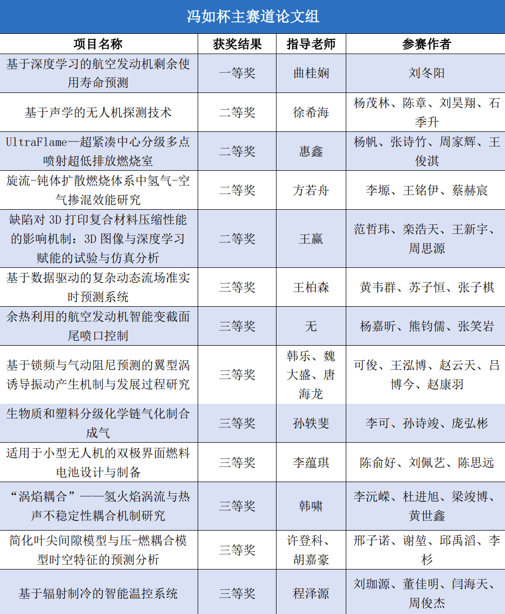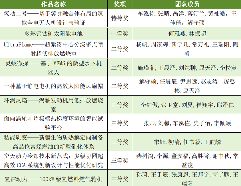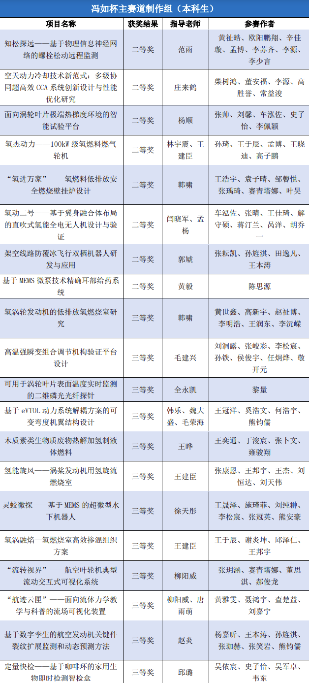 动力学院学子共有159个项目参加本届“冯如杯”的激烈角逐并斩获优异成绩。主赛道本科生制作组二等奖8项、三等奖12项,主赛道本科生论文组一等奖1项、二等奖4项、三等奖8项,主赛道研究生制作组三等奖2项,红旅赛道铜奖1项,创意赛道一等奖1项、二等奖3项、三等奖4项。