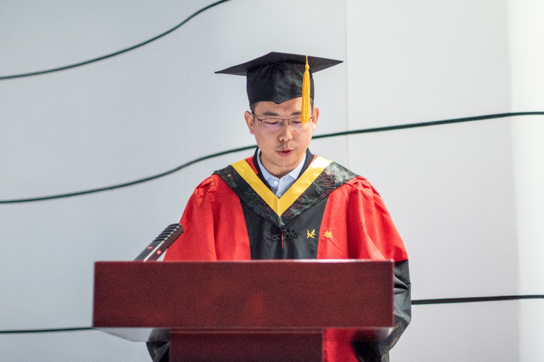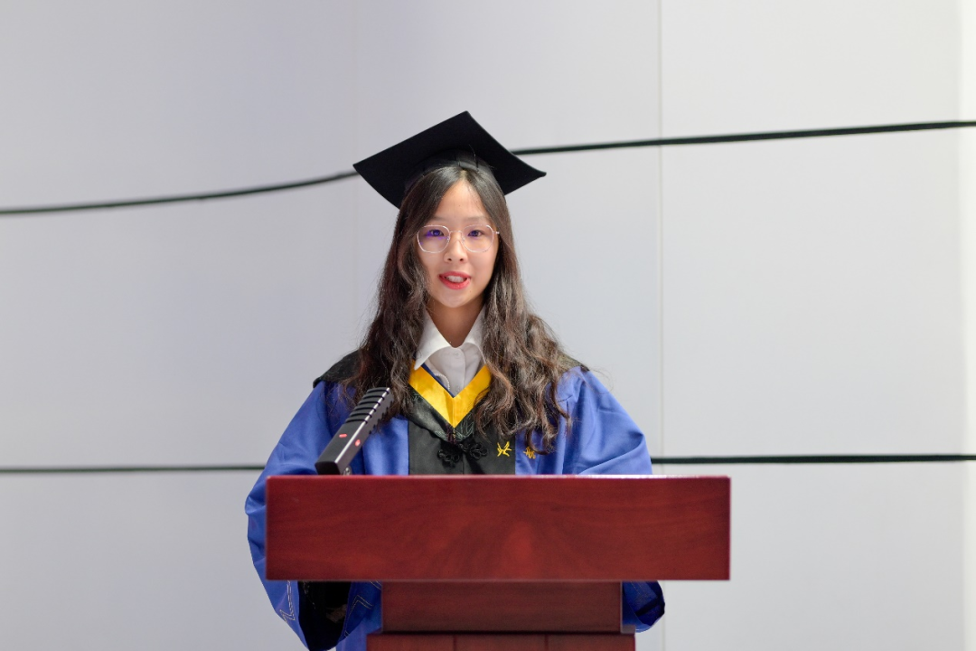 毕业生代表张芊同学,回顾了在jinnianhui金年会诚信至上的求学历程,讲述了她在仰望星空中融入“大我”成就“小我”,探索“未知”开启“真知”,追寻初心,勇担使命的故事。