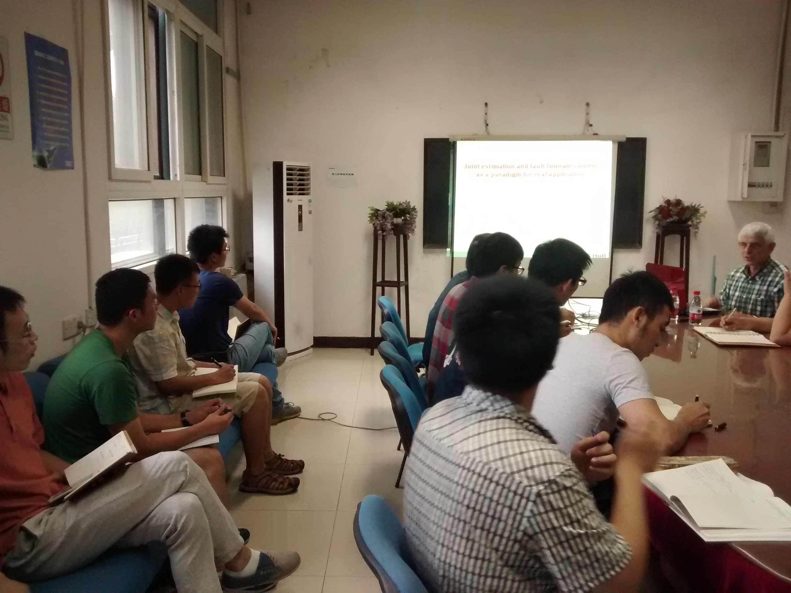 在当天的报告会上,Patton教授以《Joint estimation and fault tolerant control as a paradigm for real application》为题,作了近3个小时的学术报告,以故障诊断和容错控制的应用实例为切入点,为金年会师生介绍了将优秀的容错控制性能和鲁棒设计相结合的设计过程,详细描述了故障诊断和容错控制的工程应用及未来的发展前景。报告内容深入浅出,在场师生认真聆听了学术报告,并积极地与Patton教授进行了关于各个专业领域里容错控制问题的学术讨论。其间,参会的研究生同学积极提问,Patton教授耐心回答同学们提出的各种问题,并语重心长的提醒现场的师生,不能纸上谈兵,要把学术问题放在实际应用中。在座师生被Patton教授幽默的谈吐风格、深厚的专业素养和广阔的专业视角所深深折服,并受益匪浅。