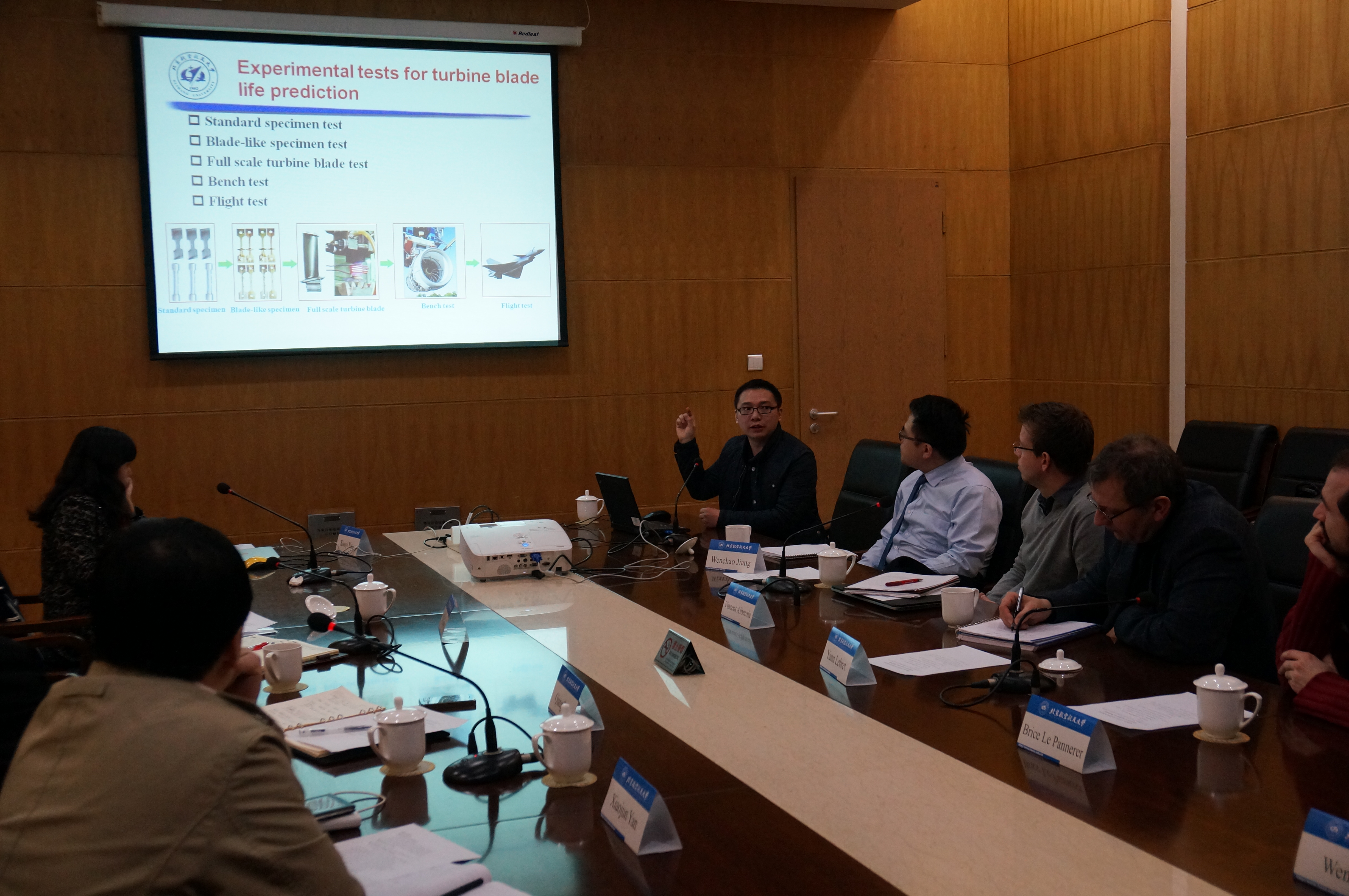 2015年03月19日,中航工业南方公司-赛峰集团斯奈克玛公司民用涡桨发动机合资公司项目法方负责人Yann Lebret先生、燃烧室工程师Vincent Alberola先生、燃烧室工程师Brice Le Pannerer先生、业务发展工程师蒋文超先生和中航工业发动机公司国际合作部刘晓嘉博士、中航工业608所涡轮部徐文奇高级工程师组成的代表团来金年会访问并洽谈科研合作,金年会科学技术研究院基础研究院相艳院长、张巍副院长、jinnianhui金年会诚信至上丁水汀院长、王强书记、闫晓军副院长、杨晓奕副院长和相关教授在新主楼第三会议室接待了代表团,并向代表团详细介绍了北航发展概况、科研重点和和建议合作领域。