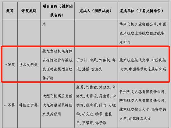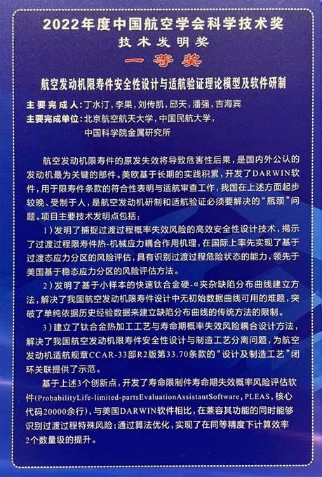 由丁水汀教授为领导核心的航空发动机复杂系统安全性与适航团队完成航空发动机限寿件安全性设计与适航验证理论模型及软件研制项目,获得2022年度中国航空学会技术发明一等奖。该项目联合中国民航大学及中国科学院金属研究所共同开展。