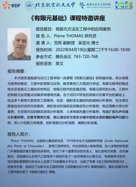 2022年04月19日下午16:00-18:00,应金年会范雨副教授邀请,作为金年会“航空推进理论与工程111引智基地”专家,法国电力集团研究员Pierre THOMAS 研究员为金年会师生作了题目为“有限元方法在工程中的应用案例”的线上报告。